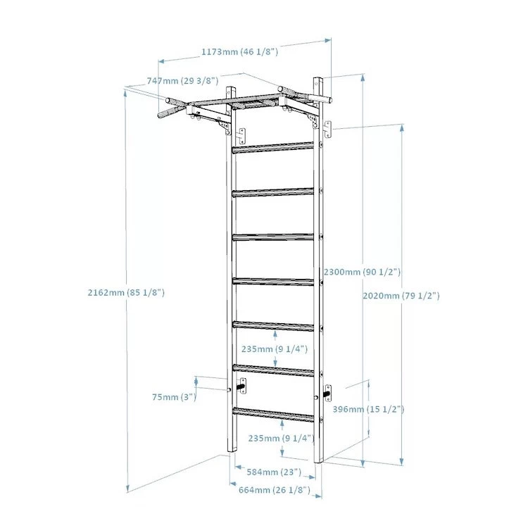 Includes assembly kit (does not include wall mounting set, as its type depends on the type of wall which the wall bars will be attached to). The decision and responsibility for the method of installation of the wall bars rests with the customer. Wall mounting is not possible to a plasterboard wall. The minimum required wall thickness in the case of installation with the use of Fischer expansion bolts available from BenchK is 12 cm/4,7″. In all other cases, it is a recommended thickness only. For other wall fixings please see manufacturers recommendations.