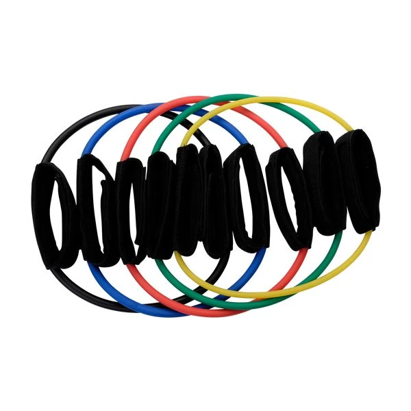Tubes are available in five color-coded resistance levels: Yellow (Very Light), Green (Light), Red (Medium), Blue (Heavy) and Black (Very Heavy).