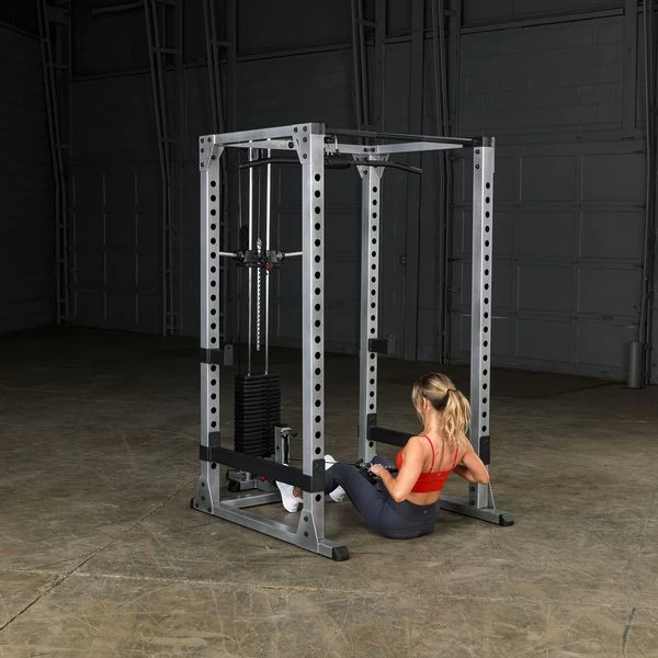 Transform your Body-Solid Power Rack into a multi-workout machine. This Lat Attachment will help you build a wider, beefier Back and/or stronger and bigger Biceps and Triceps. Features nylon coated, aircraft quality (2200 Lb. test) cables. The Plate-Load carriage on this Lat Attachment features 1″ diameter weight posts that will accommodate Standard or Olympic Weight Plates. Includes Lat Bar and Low Row Bar.