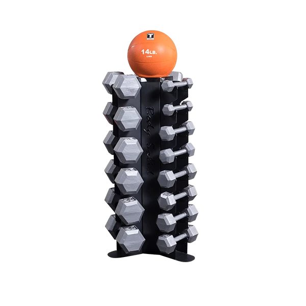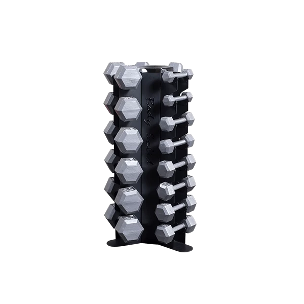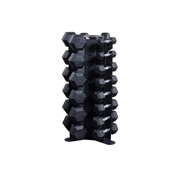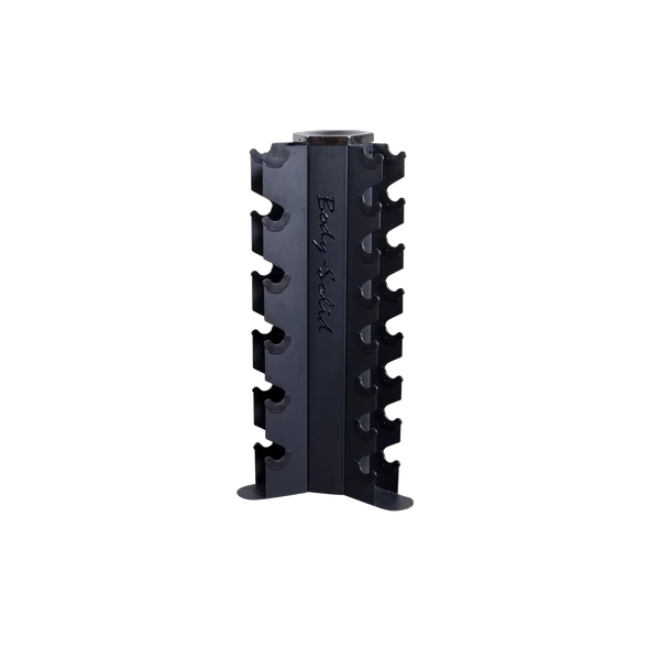 Body-Solid’s GDR80 Body-Solid Vertical Dumbbell Rack features vertical storage for 10 pairs of dumbbells, keeping workout spaces clean, organized and safe. The GDR80 conveniently holds up to 10 pairs of hex dumbbells of any size under 50lbs, and is perfect for home or studio use. A perfect fit for a 5-50lb hex dumbbell set, the GDR80’s compact vertical storage minimizes floor space compared to horizontal racks.