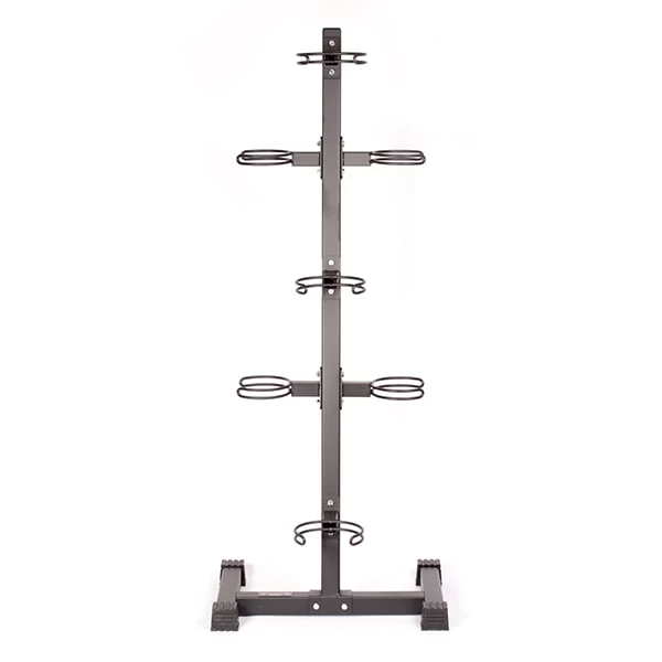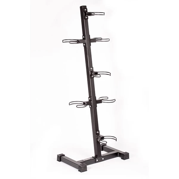 This vertical rack stores seven York medicine balls of any size in an easy to access format with three in the front and two on each side. The angled frame provides for equal weight distribution and plastic foot caps protect flooring.